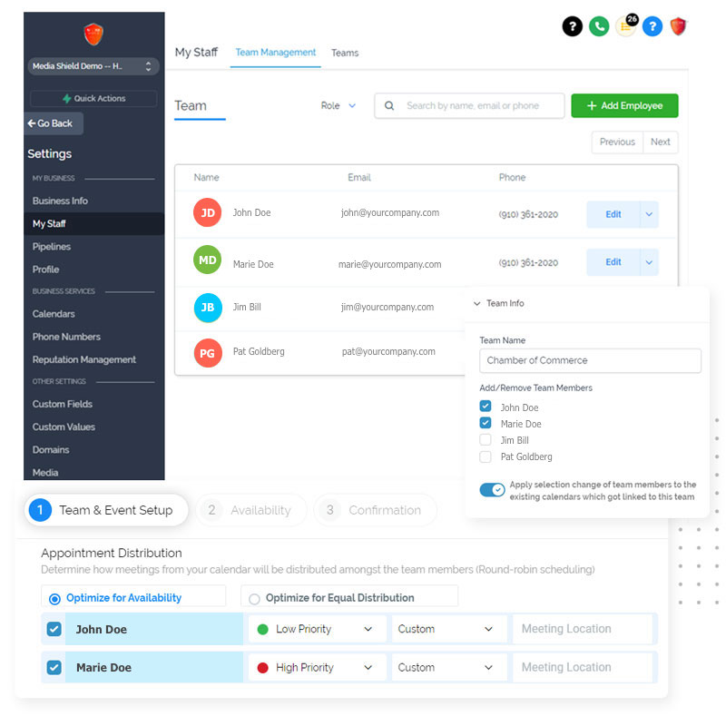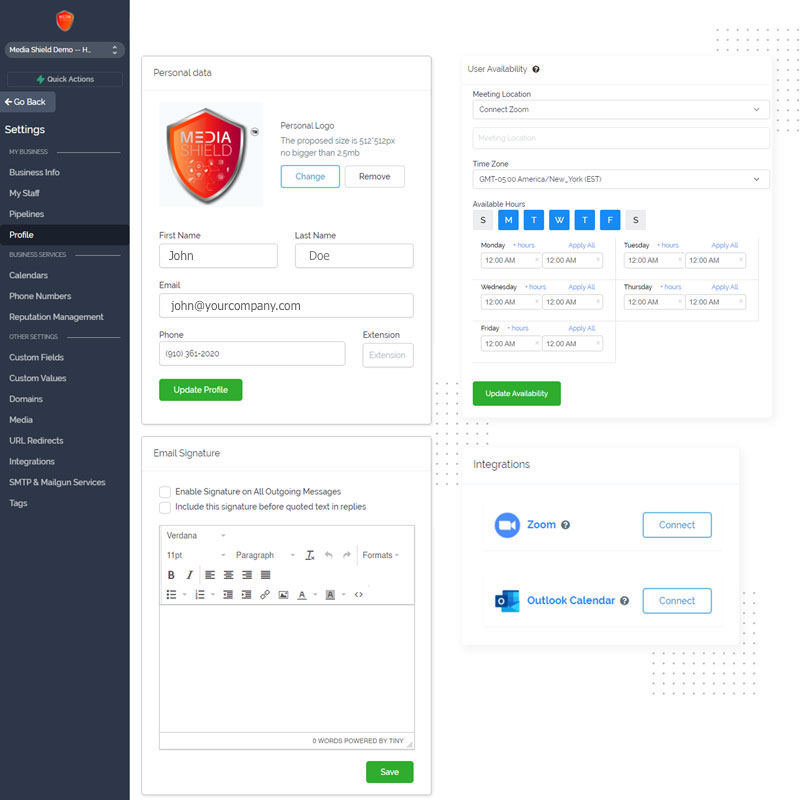 Media Shield team management software allows small businesses to modify their profile and make it easy to manage their teams. Small businesses can integrate their account with their own Video App software and calendar widget and set their availability.